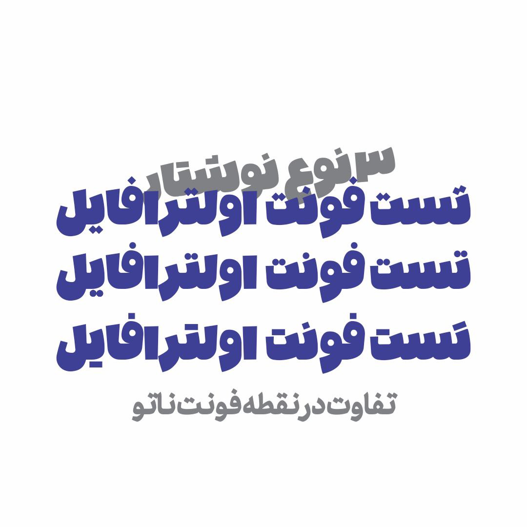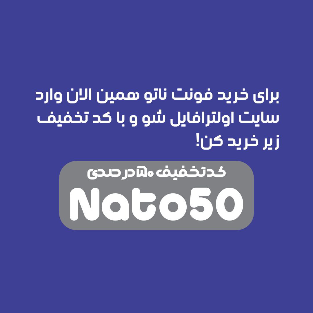 فونت ناتو جدیدترین فونت ارائه شده در وب سایت اولترافایل است. در ایجاد اغلب حروف این فونت، به کاربری حروف نسخ بسیار توجه شده که این موضوع شخصیتی ساده ولی در عین حال پویا به این فونت بخشیده است. فاصله (space) بین آخرین و اولین کاراکتر (برای مثال کاراکتر “ن” در کلمه “ایران” و کاراکتر “ف” در کلمه “فونت” به طور محسوس)، کم در نظر گرفته شده تا هم ترازی حروف به وضوح قابل مشاهده باشد. همچنین ناتو از اعداد و علائم نقطه گذاری (کاما، ویرگول و…) هم عرض بهره می برد تا بیش از پیش به خوانایی (legibility) این فونت بیفزاید.