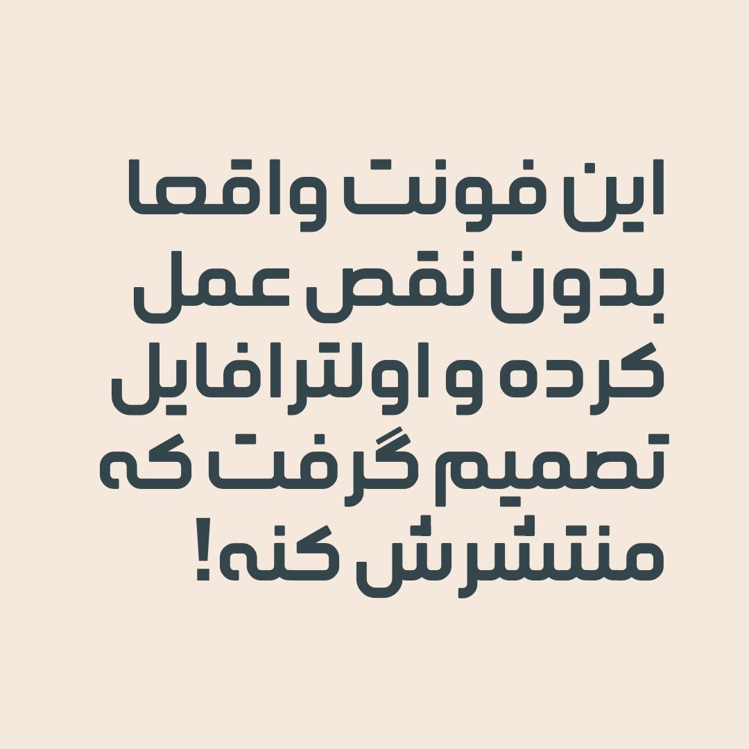 در هر صورت این تایپ فیس در هر جایی به خوبی دیده می‌شود و زیبایی‌اش را به نمایش می‌گذارد. البته این وزنی که فعلا ارائه شده ممکن است زیاد مناسب متون ریز و کوچک نباشد؛ اما قطعا وزن Bold آن که بعدا ارائه خواهد شد دارای این قابلیت خواهد بود که حتی در متون ریز و کوچک خوانایی بالایی داشته باشد